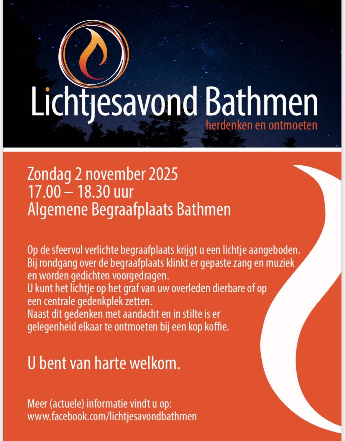 Op 2 november vndt dit jaar weer lichtesavond plaats. Op de begraafplaats van Bathmen krijgt u een lichtje aangeboden. Hierna volgt een rondgang door de begraafplaats met zang, muziek en gedichten.