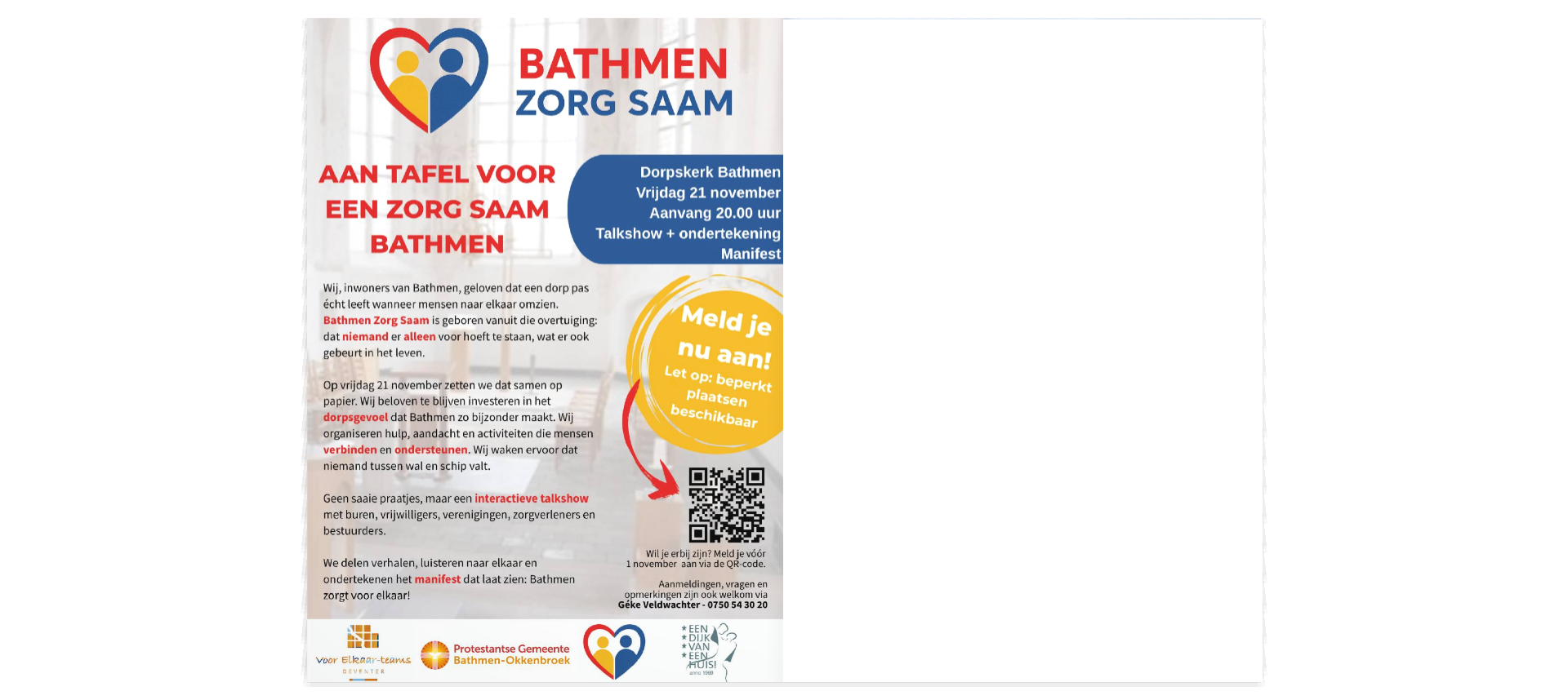 Samen met o.a. de Stichting NoBeL (dorpsondersteuners), de Voor Elkaar-teams Deventer, woon-zorg-en dienstencentrum ’t Dijkhuis gaat onze kerkelijke gemeente participeren in het Netwerk Bathmen Zorg Saam. Dit wil inwoners, vrijwilligers, verenigingen, zorgorganisaties en andere bestaande of toekomstige initiatieven verbinden. Door samen te werken, kennis te delen en elkaar aan te vullen, maken we hulp makkelijker vindbaar en toegankelijk voor iedereen.