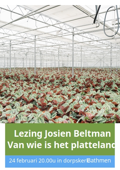 Lezing Josien Beltman. Terugblik op het project ‘Van wie is het platteland’ en de rol van het museumJosien Beltman is kunsthistoricus met een focus op moderne en hedendaagse kunst. Zij werkt als conservator in Rijksmuseum Twenthe.In 2023 organiseerde het museum een groot project rondom de vraag ‘van wie is het (platte)land?’ Veel actuele kwesties komen namelijk samen in het landelijk gebied: van stikstof en energietransitie tot biodiversiteitsverlies en woningnood. Maar van wie is het land eigenlijk? En hoe kunnen we er in de toekomst mee omgaan? Aan de hand van kunstwerken vanaf 1500 tot nu werd getoond hoe de mens door de eeuwen heen het land heeft gecultiveerd en toegeëigend om het economisch nuttig te maken. Daarnaast had het museum vier kunstenaars uitgenodigd om onderzoek te doen naar de dilemma’s die zich manifesteren op het platteland van Twente. Naar aanleiding van dit project zijn verschillende kunstwerken aangekocht die op dit moment nog in het museum zijn te zien. In deze lezing blikt Josien terug op het project en op de verschillende kunstwerken die eruit zijn voortgevloeid. Ook gaat ze in op de rol die een museum kan spelen in de 21ste eeuw. Niet alleen een plek om kunst te tonen, maar ook een plek voor maatschappelijke dialoog. Wanneer: dinsdag 24 februari Waar: kerk Bathmen Tijd: 20.00 -21.45 uur | ||
