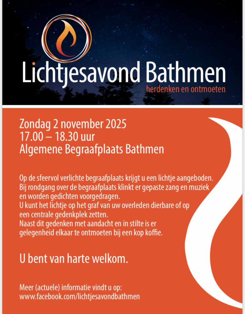 Op 2 november vndt de jaarlijkse lichtjesavond plaats op de Algemene begraafplaats te Bathmen. Aanvang 17:00. U krijgt bij aankomst een lichtje aangeboden. Hierna volgt een rondgang over de begraafplaats met muziek, zang en gedichten. U kunt bij het graf van uw dierbare het lichtje plaatsen. Verwacht einde om 18:30. Welkom! | ||